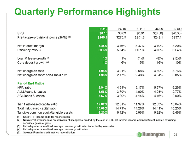 | Positioning for Growth 28 3Q10 HighlightsIncreased Brand InvestmentRetail and Business BankingIntroduced "Fair Play" banking philosophyLaunched 24-Hour Grace(tm)Signed 15-year agreement with Giant Eagle to rollout 103 full service in-store branches... making Huntington the most convenient bank in Ohio (1)Auto Finance and Dealer ServicesExpanded into 5 New England states... MA, RI, VT, NH, ME (1) Pro-forma based on existing data |