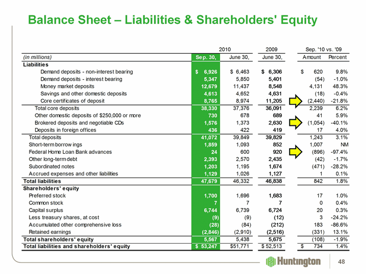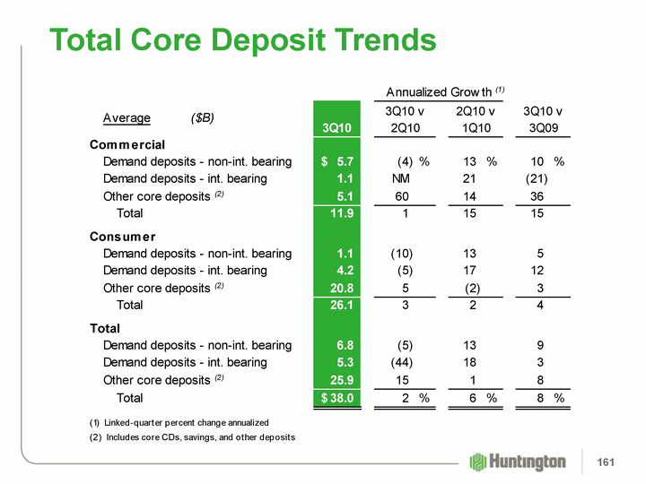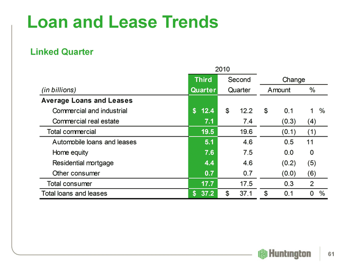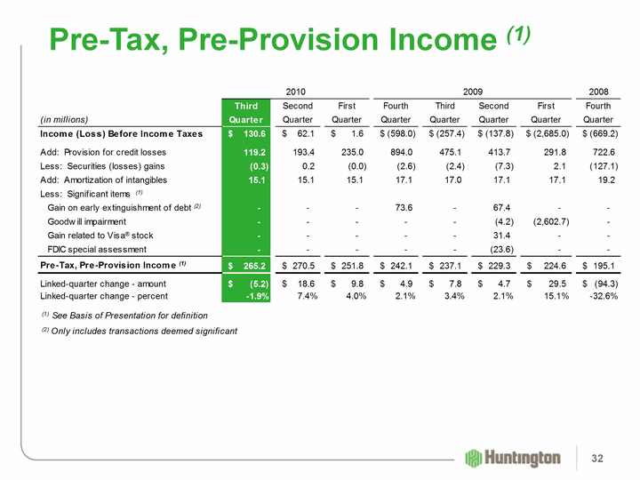 | The Huntington Franchise 173 Branches 119ATMs 242Detroit 4%Grand Rapids 10% Branches 341ATMs 748Akron 8%Canton 27%Cincinnati 4%Cleveland 5%Columbus 22%Dayton 6%Toledo 23% Youngstown 20% Branches 50ATMs 80Indianapolis 6% Branches 13ATMs 30 Branches 28ATMs 133Charleston 11% Excludes 9 PFG offices (3 in FL) and 2 ATMs in MD. Market share at 6/30/10 Branches 608ATMs 1,359 Branches 57ATMs 124Pittsburgh 3% |