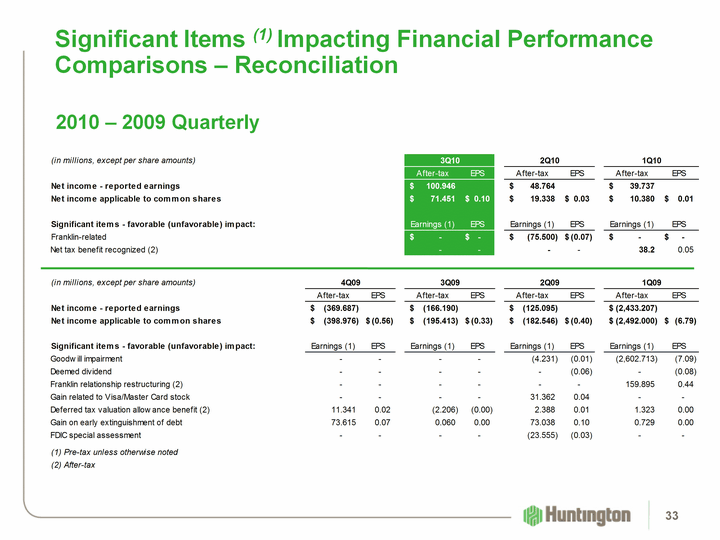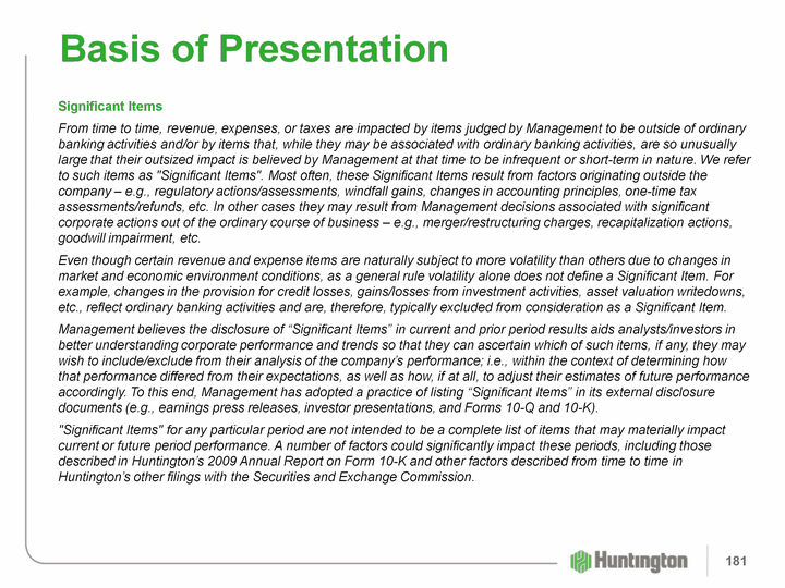 | Basis of Presentation Significant ItemsFrom time to time, revenue, expenses, or taxes are impacted by items judged by Management to be outside of ordinary banking activities and/or by items that, while they may be associated with ordinary banking activities, are so unusually large that their outsized impact is believed by Management at that time to be infrequent or short-term in nature. We refer to such items as "Significant Items". Most often, these Significant Items result from factors originating outside the company - e.g., regulatory actions/assessments, windfall gains, changes in accounting principles, one-time tax assessments/refunds, etc. In other cases they may result from Management decisions associated with significant corporate actions out of the ordinary course of business - e.g., merger/restructuring charges, recapitalization actions, goodwill impairment, etc. Even though certain revenue and expense items are naturally subject to more volatility than others due to changes in market and economic environment conditions, as a general rule volatility alone does not define a Significant Item. For example, changes in the provision for credit losses, gains/losses from investment activities, asset valuation writedowns, etc., reflect ordinary banking activities and are, therefore, typically excluded from consideration as a Significant Item.Management believes the disclosure of "Significant Items" in current and prior period results aids analysts/investors in better understanding corporate performance and trends so that they can ascertain which of such items, if any, they may wish to include/exclude from their analysis of the company's performance; i.e., within the context of determining how that performance differed from their expectations, as well as how, if at all, to adjust their estimates of future performance accordingly. To this end, Management has adopted a practice of listing "Significant Items" in its external disclosure documents (e.g., earnings press releases, investor presentations, and Forms 10-Q and 10-K)."Significant Items" for any particular period are not intended to be a complete list of items that may materially impact current or future period performance. A number of factors could significantly impact these periods, including those described in Huntington's 2009 Annual Report on Form 10-K and other factors described from time to time in Huntington's other filings with the Securities and Exchange Commission. 181 |