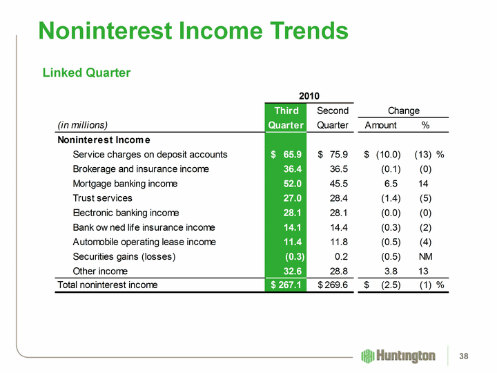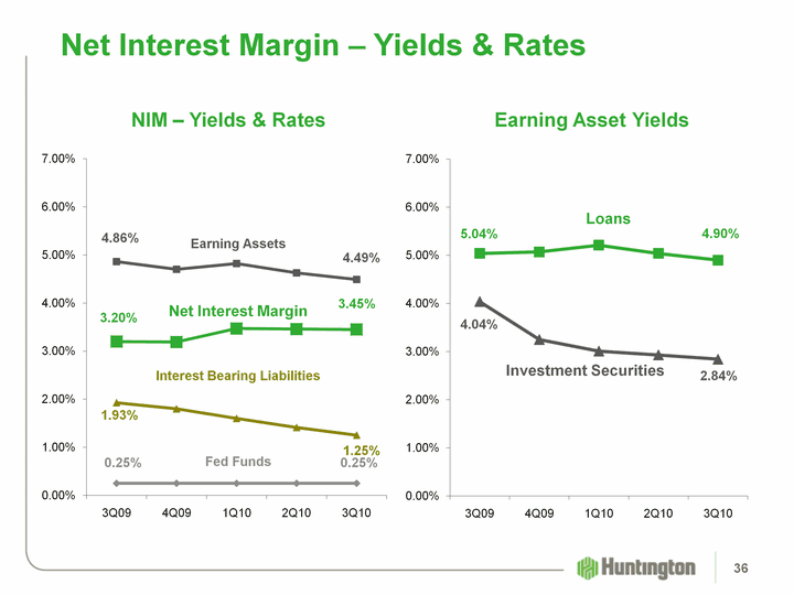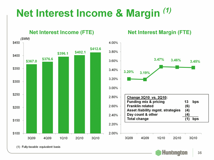 | (CHART) (CHART) Change 3Q10 vs. 2Q10:Funding mix & pricing 13 bpsFranklin related (6)Asset /liability mgmt. strategies (4) Day count & other (4) Total change (1) bps Net Interest Income & Margin (1) 35 ($MM) (1) Fully-taxable equivalent basis Net Interest Margin (FTE) Net Interest Income (FTE) |