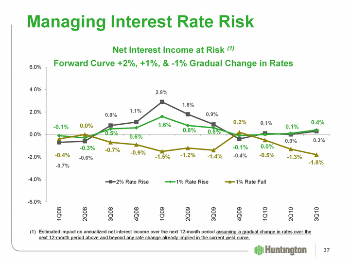 | (CHART) Managing Interest Rate Risk 37 Estimated impact on annualized net interest income over the next 12-month period assuming a gradual change in rates over the next 12-month period above and beyond any rate change already implied in the current yield curve. Net Interest Income at Risk (1) Forward Curve +2%, +1%, & -1% Gradual Change in Rates |