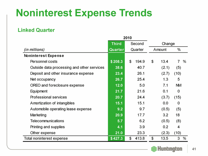 | Mortgage Banking Income 40 ($MM) 3Q10 2Q10 1Q10 4Q09 3Q09 Origination & secondary marketing $35.8 $19.8 $13.6 $16.5 $16.5 Servicing fees 12.1 12.2 12.4 12.3 12.3 Amortization of capitalized servicing (13.0) (10.1) (10.1) (10.8) (10.1) Other mortgage banking income 5.0 3.7 3.2 4.5 4.1 Sub-total 39.9 25.5 19.1 22.4 22.9 MSR recovery (impairment) (12.0) (26.2) (5.8) 15.5 (17.3) Net trading gains (losses) 24.2 46.2 11.7 (13.3) 15.9 Total $52.0 $45.5 $25.0 $24.6 $21.4 Investor servicing portfolio (1) ($B) $15.7 $16.0 $16.0 $16.0 $16.1 Weighted average coupon 5.48% 5.55% 5.61% 5.68% 5.73% Originations ($B) $1.6 $1.2 $0.9 $1.1 $1.0 Mortgage servicing rights (1) $161.6 $179.1 $207.6 $214.6 $201.0 MSR % of investor servicing portfolio (1) 1.03% 1.12% 1.30% 1.34% 1.24% (1) End-of-period |