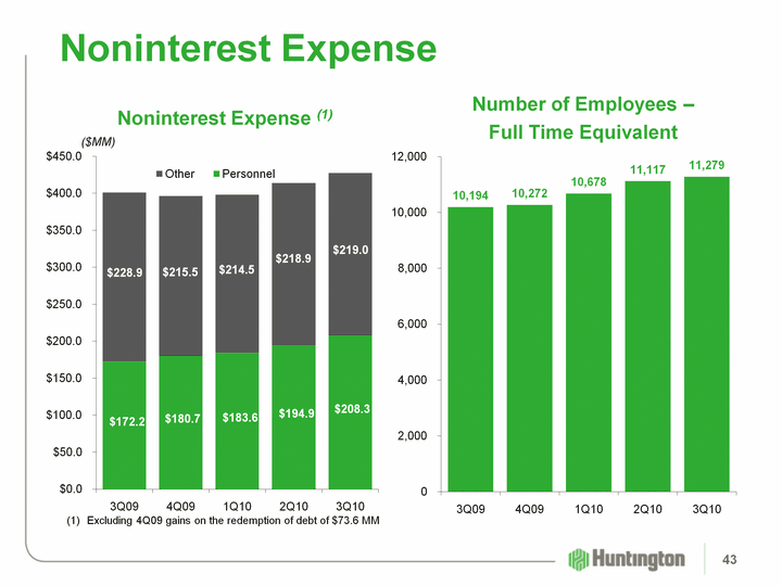 | Noninterest Expense 43 (CHART) (CHART) ($MM) (1) Excluding 4Q09 gains on the redemption of debt of $73.6 MM Number of Employees - Full Time Equivalent Noninterest Expense (1) |