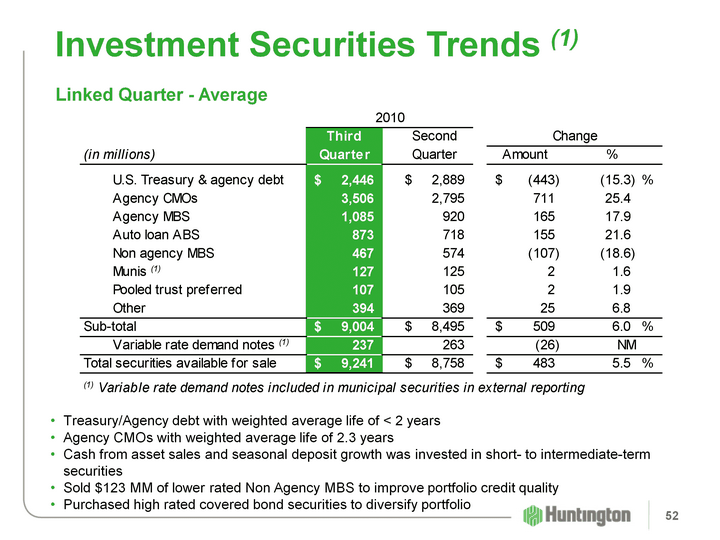 | Investment Securities Trends (1) 52 Linked Quarter - Average Treasury/Agency debt with weighted average life of < 2 yearsAgency CMOs with weighted average life of 2.3 yearsCash from asset sales and seasonal deposit growth was invested in short- to intermediate-term securitiesSold $123 MM of lower rated Non Agency MBS to improve portfolio credit qualityPurchased high rated covered bond securities to diversify portfolio |