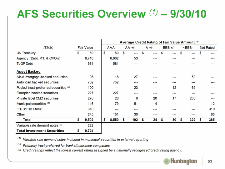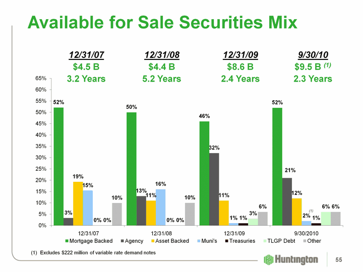 | (CHART) Available for Sale Securities Mix 55 9/30/10$9.5 B (1)2.3 Years 12/31/07$4.5 B3.2 Years 12/31/08$4.4 B5.2 Years 12/31/09$8.6 B2.4 Years Excludes $222 million of variable rate demand notes (1) |