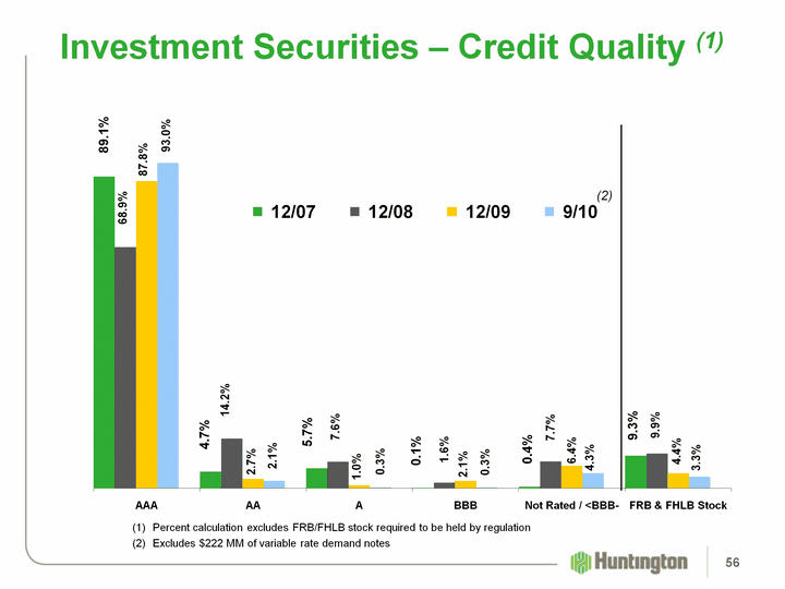 | (CHART) Investment Securities - Credit Quality (1) 56 (1) Percent calculation excludes FRB/FHLB stock required to be held by regulation(2) Excludes $222 MM of variable rate demand notes (2) |