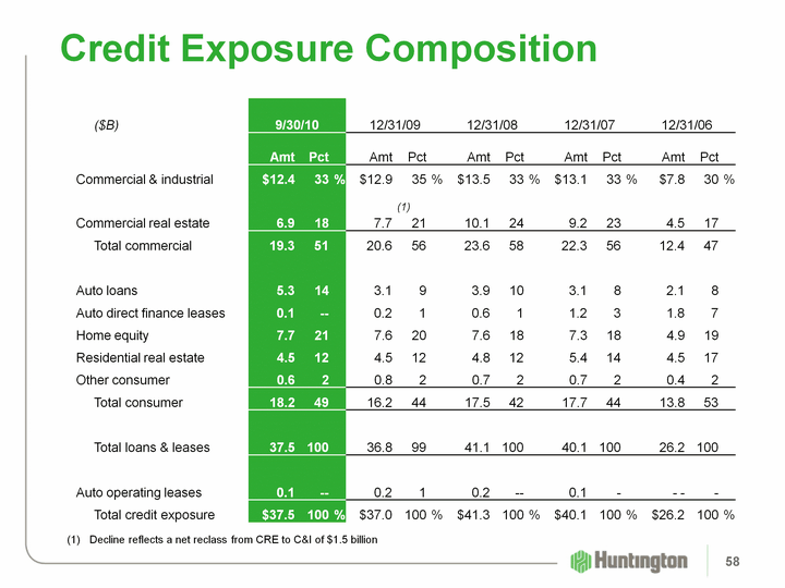 | Credit Exposure Composition 58 ($B) 9/30/10 9/30/10 9/30/10 12/31/09 12/31/09 12/31/09 12/31/08 12/31/08 12/31/08 12/31/07 12/31/07 12/31/07 12/31/06 12/31/06 12/31/06 Amt Pct Amt Pct Amt Pct Amt Pct Amt Pct Commercial & industrial $12.4 33 % $12.9 35 % $13.5 33 % $13.1 33 % $7.8 30 % Commercial real estate 6.9 18 7.7 21 10.1 24 9.2 23 4.5 17 Total commercial 19.3 51 20.6 56 23.6 58 22.3 56 12.4 47 Auto loans 5.3 14 3.1 9 3.9 10 3.1 8 2.1 8 Auto direct finance leases 0.1 -- 0.2 1 0.6 1 1.2 3 1.8 7 Home equity 7.7 21 7.6 20 7.6 18 7.3 18 4.9 19 Residential real estate 4.5 12 4.5 12 4.8 12 5.4 14 4.5 17 Other consumer 0.6 2 0.8 2 0.7 2 0.7 2 0.4 2 Total consumer 18.2 49 16.2 44 17.5 42 17.7 44 13.8 53 Total loans & leases 37.5 100 36.8 99 41.1 100 40.1 100 26.2 100 Auto operating leases 0.1 -- 0.2 1 0.2 -- 0.1 - - - - Total credit exposure $37.5 100 % $37.0 100 % $41.3 100 % $40.1 100 % $26.2 100 % (1) Decline reflects a net reclass from CRE to C&I of $1.5 billion (1) |