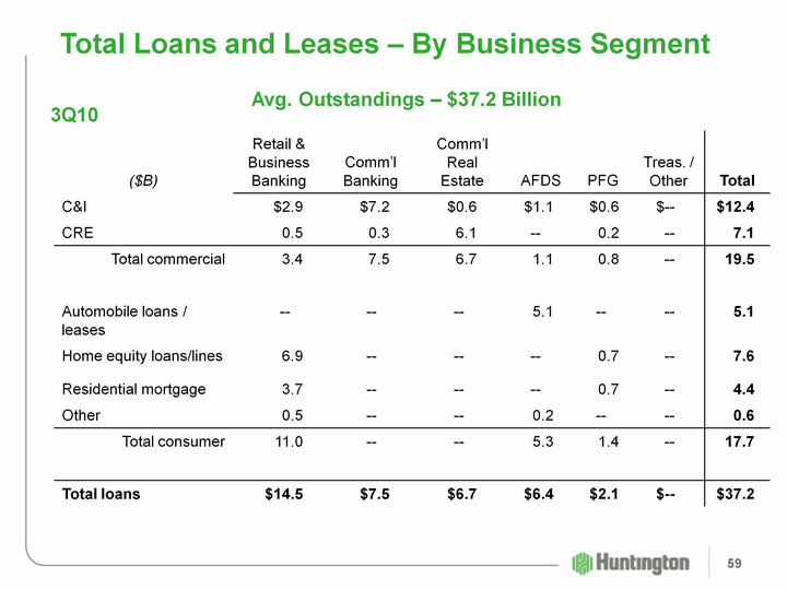 | Total Loans and Leases - By Business Segment 59 59 Avg. Outstandings - $37.2 Billion 3Q10 |