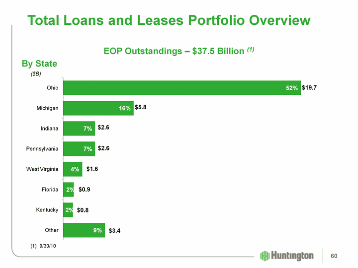 | (CHART) Total Loans and Leases Portfolio Overview 60 ($B) $19.7 $5.8 $2.6 $0.9 $2.6 $1.6 $0.8 $3.4 EOP Outstandings - $37.5 Billion (1) (1) 9/30/10 By State |