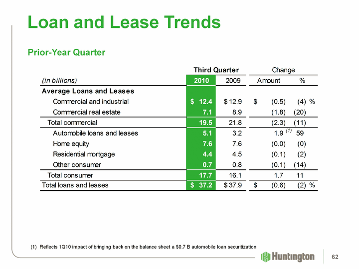 | Loan and Lease Trends 62 Prior-Year Quarter (1) Reflects 1Q10 impact of bringing back on the balance sheet a $0.7 B automobile loan securitization (1) |