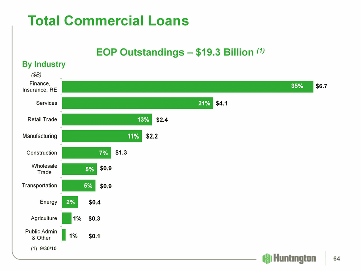 | (CHART) Total Commercial Loans 64 ($B) EOP Outstandings - $19.3 Billion (1) (1) 9/30/10 By Industry $6.7 $4.1 $2.2 $2.4 $1.3 $0.9 $0.9 $0.4 $0.3 $0.1 |