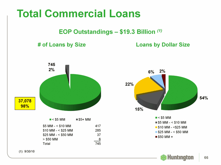 | (CHART) Total Commercial Loans 66 EOP Outstandings - $19.3 Billion (1) (CHART) 745 2% 37,07898% (1) 9/30/10 Loans by Dollar Size # of Loans by Size $5 MM - < $10 MM 417$10 MM - < $25 MM 285$25 MM - < $50 MM 37> $50 MM 6Total 745 |