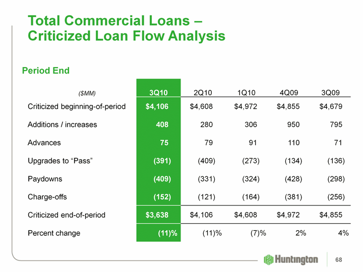 | ($MM) 3Q10 2Q10 1Q10 4Q09 3Q09 Criticized beginning-of-period $4,106 $4,608 $4,972 $4,855 $4,679 Additions / increases 408 280 306 950 795 Advances 75 79 91 110 71 Upgrades to "Pass" (391) (409) (273) (134) (136) Paydowns (409) (331) (324) (428) (298) Charge-offs (152) (121) (164) (381) (256) Criticized end-of-period $3,638 $4,106 $4,608 $4,972 $4,855 Percent change (11)% (11)% (7)% 2% 4% Total Commercial Loans - Criticized Loan Flow Analysis 68 Period End |