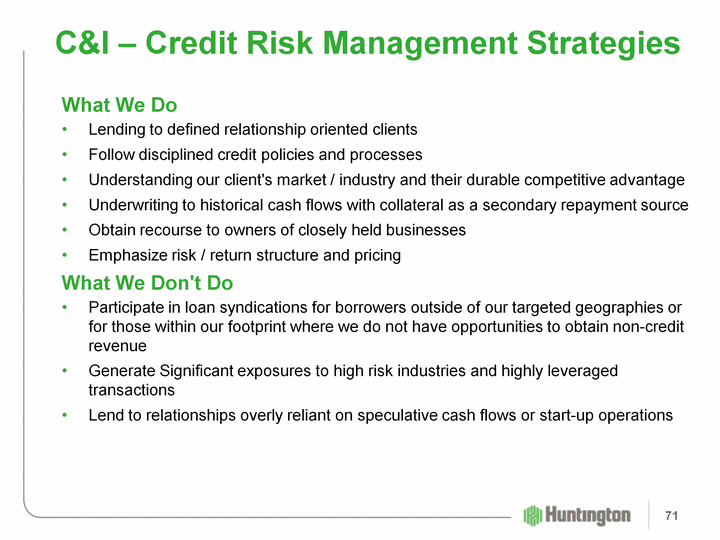 | C&I - Credit Risk Management Strategies 71 What We DoLending to defined relationship oriented clientsFollow disciplined credit policies and processesUnderstanding our client's market / industry and their durable competitive advantageUnderwriting to historical cash flows with collateral as a secondary repayment sourceObtain recourse to owners of closely held businessesEmphasize risk / return structure and pricingWhat We Don't DoParticipate in loan syndications for borrowers outside of our targeted geographies or for those within our footprint where we do not have opportunities to obtain non-credit revenueGenerate Significant exposures to high risk industries and highly leveraged transactions Lend to relationships overly reliant on speculative cash flows or start-up operations 71 |