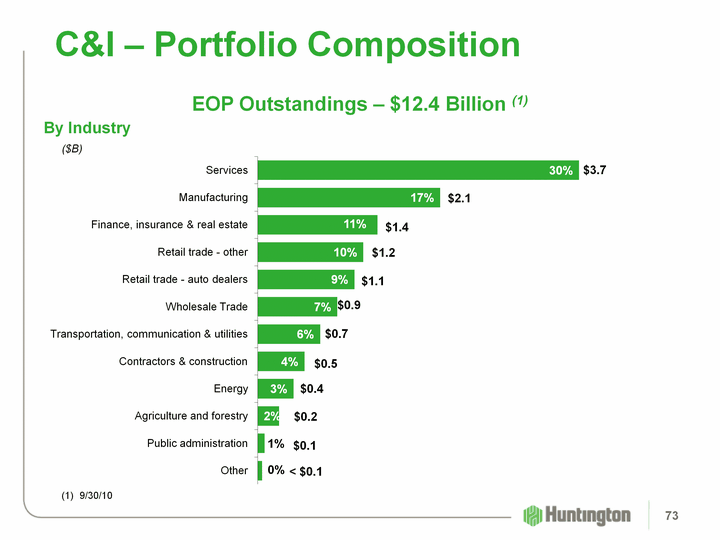 | (CHART) C&I - Portfolio Composition 73 ($B) EOP Outstandings - $12.4 Billion (1) (1) 9/30/10 By Industry $3.7 $2.1 $1.4 $1.2 $1.1 $0.9 $0.7 $0.5 $0.4 $0.2 $0.1 < $0.1 |