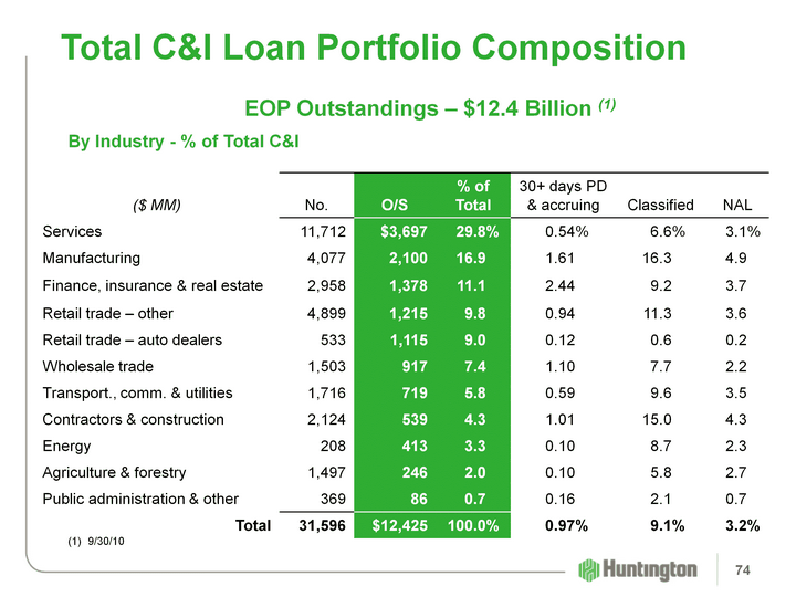 | Total C&I Loan Portfolio Composition 74 74 By Industry - % of Total C&I EOP Outstandings - $12.4 Billion (1) (1) 9/30/10 ($ MM) No. O/S % of Total 30+ days PD & accruing Classified NAL Services 11,712 $3,697 29.8% 0.54% 6.6% 3.1% Manufacturing 4,077 2,100 16.9 1.61 16.3 4.9 Finance, insurance & real estate 2,958 1,378 11.1 2.44 9.2 3.7 Retail trade - other 4,899 1,215 9.8 0.94 11.3 3.6 Retail trade - auto dealers 533 1,115 9.0 0.12 0.6 0.2 Wholesale trade 1,503 917 7.4 1.10 7.7 2.2 Transport., comm. & utilities 1,716 719 5.8 0.59 9.6 3.5 Contractors & construction 2,124 539 4.3 1.01 15.0 4.3 Energy 208 413 3.3 0.10 8.7 2.3 Agriculture & forestry 1,497 246 2.0 0.10 5.8 2.7 Public administration & other 369 86 0.7 0.16 2.1 0.7 Total 31,596 $12,425 100.0% 0.97% 9.1% 3.2% |