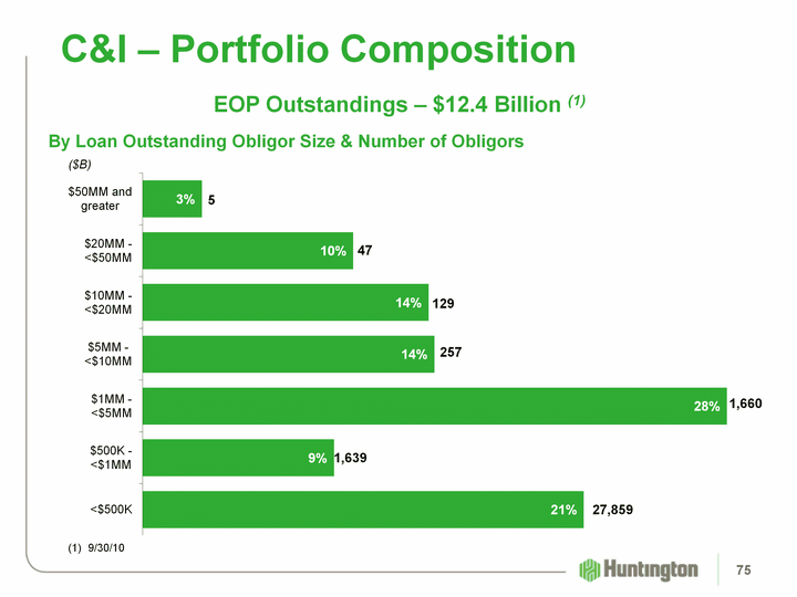 | (CHART) C&I - Portfolio Composition 75 ($B) EOP Outstandings - $12.4 Billion (1) (1) 9/30/10 By Loan Outstanding Obligor Size & Number of Obligors 5 47 129 257 1,660 1,639 27,859 |