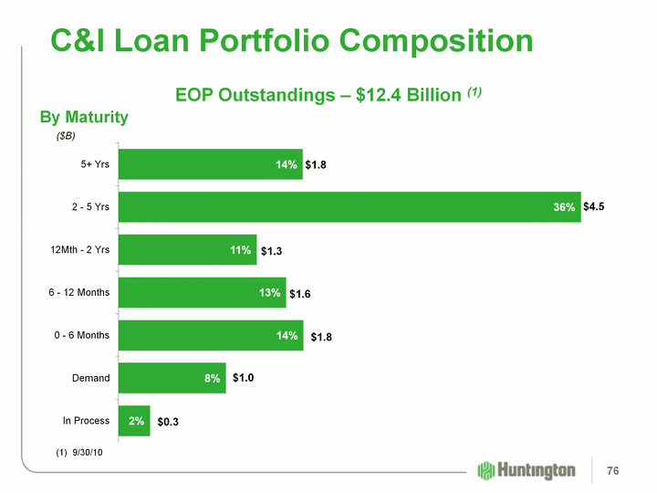 | (CHART) C&I Loan Portfolio Composition 76 ($B) EOP Outstandings - $12.4 Billion (1) (1) 9/30/10 By Maturity $1.8 $4.5 $1.3 $1.6 $1.8 $1.0 $0.3 |
