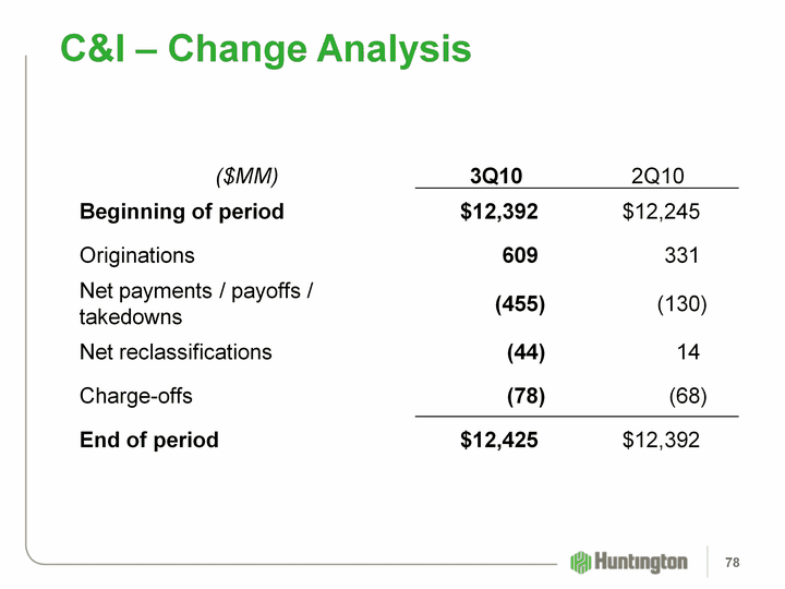 | C&I - Change Analysis 78 ($MM) 3Q10 2Q10 Beginning of period $12,392 $12,245 Originations 609 331 Net payments / payoffs / takedowns (455) (130) Net reclassifications (44) 14 Charge-offs (78) (68) End of period $12,425 $12,392 |