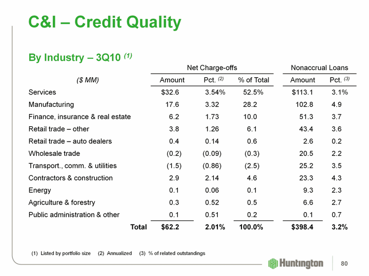| C&I - Credit Quality 80 Net Charge-offs Net Charge-offs Net Charge-offs Nonaccrual Loans Nonaccrual Loans ($ MM) Amount Pct. (2) % of Total Amount Pct. (3) Services $32.6 3.54% 52.5% $113.1 3.1% Manufacturing 17.6 3.32 28.2 102.8 4.9 Finance, insurance & real estate 6.2 1.73 10.0 51.3 3.7 Retail trade - other 3.8 1.26 6.1 43.4 3.6 Retail trade - auto dealers 0.4 0.14 0.6 2.6 0.2 Wholesale trade (0.2) (0.09) (0.3) 20.5 2.2 Transport., comm. & utilities (1.5) (0.86) (2.5) 25.2 3.5 Contractors & construction 2.9 2.14 4.6 23.3 4.3 Energy 0.1 0.06 0.1 9.3 2.3 Agriculture & forestry 0.3 0.52 0.5 6.6 2.7 Public administration & other 0.1 0.51 0.2 0.1 0.7 Total $62.2 2.01% 100.0% $398.4 3.2% (1) Listed by portfolio size (2) Annualized (3) % of related outstandings By Industry - 3Q10 (1) |