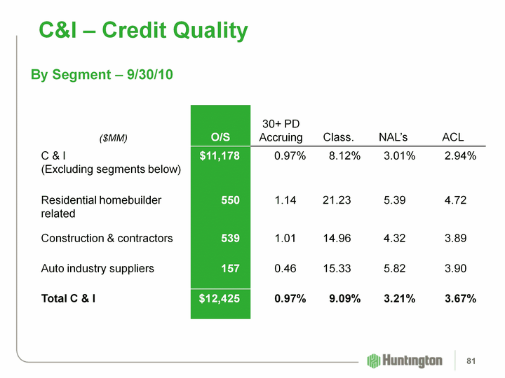 | C&I - Credit Quality 81 By Segment - 9/30/10 ($MM) O/S 30+ PD Accruing Class. NAL's ACL C & I (Excluding segments below) $11,178 0.97% 8.12% 3.01% 2.94% Residential homebuilder related 550 1.14 21.23 5.39 4.72 Construction & contractors 539 1.01 14.96 4.32 3.89 Auto industry suppliers 157 0.46 15.33 5.82 3.90 Total C & I $12,425 0.97% 9.09% 3.21% 3.67% |
