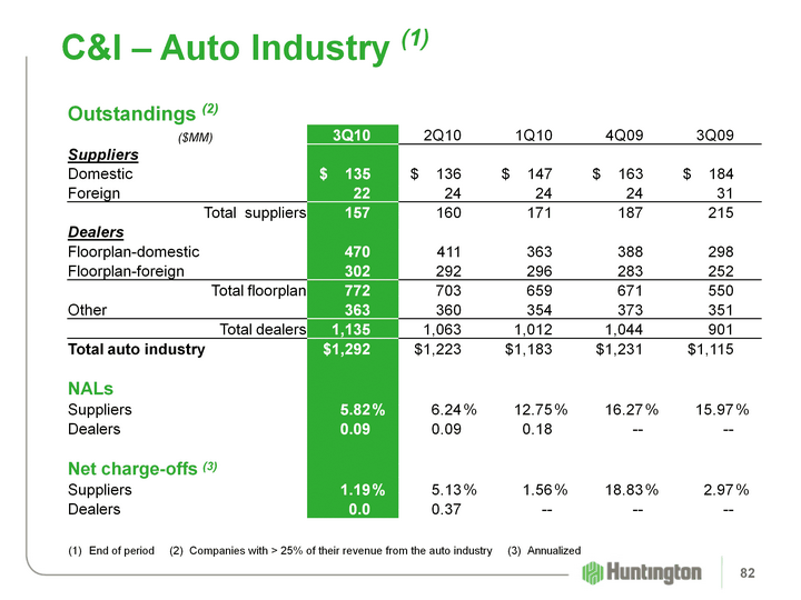 | C&I - Auto Industry (1) 82 Outstandings (2) ($MM) 3Q10 2Q10 1Q10 4Q09 3Q09 Suppliers Domestic $ 135 $ 136 $ 147 $ 163 $ 184 Foreign 22 24 24 24 31 Total suppliers 157 160 171 187 215 Dealers Floorplan-domestic 470 411 363 388 298 Floorplan-foreign 302 292 296 283 252 Total floorplan 772 703 659 671 550 Other 363 360 354 373 351 Total dealers 1,135 1,063 1,012 1,044 901 Total auto industry $1,292 $1,223 $1,183 $1,231 $1,115 NALs Suppliers 5.82 % 6.24 % 12.75 % 16.27 % 15.97 % Dealers 0.09 0.09 0.18 -- -- Net charge-offs (3) Suppliers 1.19 % 5.13 % 1.56 % 18.83 % 2.97 % Dealers 0.0 0.37 -- -- -- (1) End of period (2) Companies with > 25% of their revenue from the auto industry (3) Annualized |