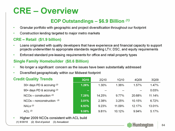 | CRE - Overview 84 EOP Outstandings - $6.9 Billion (1)Granular portfolio with geographic and project diversification throughout our footprintConstruction lending targeted to major metro marketsCRE - Retail ($1.9 billion)Loans originated with quality developers that have experience and financial capacity to support projects underwritten to appropriate standards regarding LTV, DSC, and equity requirementsEnforced standard pre-leasing requirements for office and retail property typesSingle Family Homebuilder ($0.6 Billion)No longer a significant concern as the issues have been substantially addressedDiversified geographically within our Midwest footprintCredit Quality TrendsHigher 2009 NCOs consistent with ACL build (1) 9/30/10 (2) End of period (3) Annualized 3Q10 2Q10 1Q10 4Q09 3Q09 30+ days PD & accruing (2) 1.26% 1.30% 1.36% 1.57% 1.47% 90+ days PD & accruing (2) -- -- -- -- 0.03% NCOs - construction (3) 7.25% 14.25% 9.77% 20.68% 11.14% NCOs - nonconstruction (3) 3.01% 2.38% 3.25% 10.15% 6.72% NALs (2) 6.93% 9.23% 11.09% 12.17% 13.01% ACL (2) 9.58% 9.81% 10.12% 9.94% 5.17% |