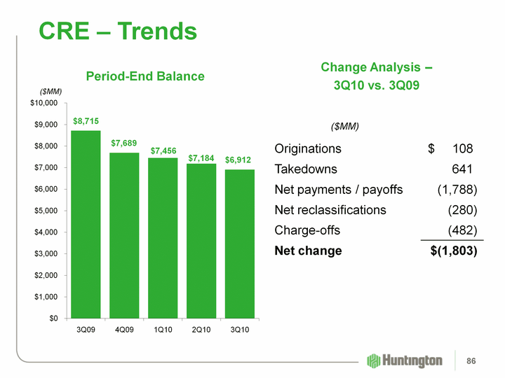 | (CHART) CRE - Trends 86 ($MM) Change Analysis - 3Q10 vs. 3Q09 Period-End Balance ($MM) Originations $ 108 Takedowns 641 Net payments / payoffs (1,788) Net reclassifications (280) Charge-offs (482) Net change $(1,803) |