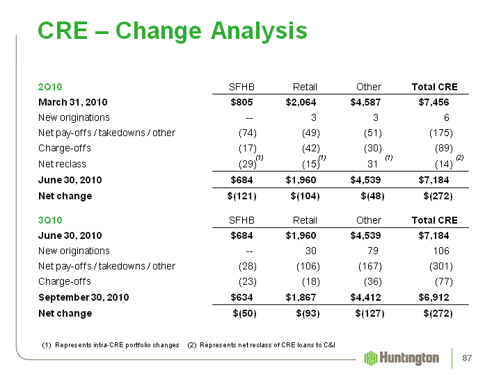 | CRE - Change Analysis 87 3Q10 SFHB Retail Other Total CRE June 30, 2010 $684 $1,960 $4,539 $7,184 New originations -- 30 79 106 Net pay-offs / takedowns / other (28) (106) (167) (301) Charge-offs (23) (18) (36) (77) September 30, 2010 $634 $1,867 $4,412 $6,912 Net change $(50) $(93) $(127) $(272) (1) Represents intra-CRE portfolio changes (2) Represents net reclass of CRE loans to C&I 2Q10 SFHB Retail Other Total CRE March 31, 2010 $805 $2,064 $4,587 $7,456 New originations -- 3 3 6 Net pay-offs / takedowns / other (74) (49) (51) (175) Charge-offs (17) (42) (30) (89) Net reclass (29) (15) 31 (14) June 30, 2010 $684 $1,960 $4,539 $7,184 Net change $(121) $(104) $(48) $(272) (1) (1) (1) (2) |
