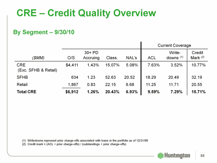 | CRE - Credit Quality Overview 88 By Segment - 9/30/10 Current Coverage Current Coverage Current Coverage ($MM) O/S 30+ PD Accruing Class. NAL's ACL Write-downs (1) Credit Mark (2) CRE (Exc. SFHB & Retail) $4,411 1.43% 15.07% 5.08% 7.63% 3.52% 10.77% SFHB 634 1.23 52.63 20.52 18.29 20.49 32.19 Retail 1,867 0.83 22.15 6.68 11.25 11.71 20.55 Total CRE $6,912 1.26% 20.43% 6.93% 9.59% 7.29% 15.71% Writedowns represent prior charge-offs associated with loans in the portfolio as of 12/31/09(2) Credit mark = (ACL + prior charge-offs) / (outstandings + prior charge-offs) |