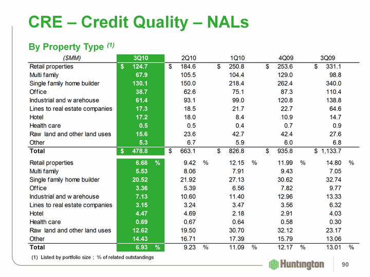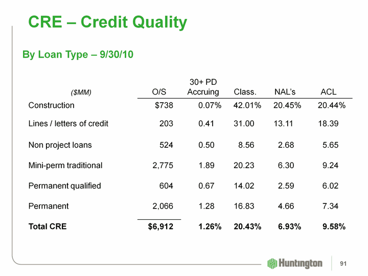| CRE - Credit Quality 91 By Loan Type - 9/30/10 ($MM) O/S 30+ PD Accruing Class. NAL's ACL Construction $738 0.07% 42.01% 20.45% 20.44% Lines / letters of credit 203 0.41 31.00 13.11 18.39 Non project loans 524 0.50 8.56 2.68 5.65 Mini-perm traditional 2,775 1.89 20.23 6.30 9.24 Permanent qualified 604 0.67 14.02 2.59 6.02 Permanent 2,066 1.28 16.83 4.66 7.34 Total CRE $6,912 1.26% 20.43% 6.93% 9.58% |