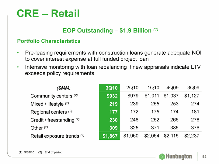 | CRE - Retail 92 ($MM) 3Q10 2Q10 1Q10 4Q09 3Q09 Community centers (2) $932 $979 $1,011 $1,037 $1,127 Mixed / lifestyle (2) 219 239 255 253 274 Regional centers (2) 177 172 175 174 181 Credit / freestanding (2) 230 246 252 266 278 Other (2) 309 325 371 385 376 Retail exposure trends (2) $1,867 $1,960 $2,064 $2,115 $2,237 EOP Outstanding - $1.9 Billion (1)Portfolio Characteristics Pre-leasing requirements with construction loans generate adequate NOI to cover interest expense at full funded project loanIntensive monitoring with loan rebalancing if new appraisals indicate LTV exceeds policy requirements (1) 9/30/10 (2) End of period |