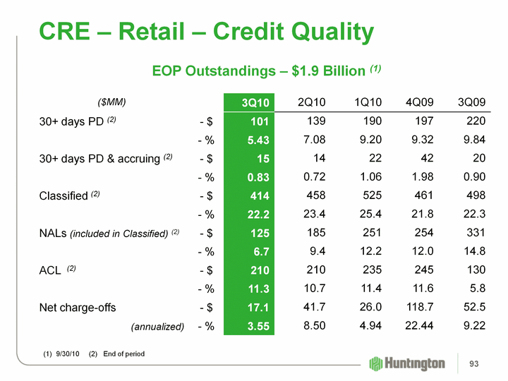 | CRE - Retail - Credit Quality 93 EOP Outstandings - $1.9 Billion (1) ($MM) 3Q10 2Q10 1Q10 4Q09 3Q09 30+ days PD (2) - $ 101 139 190 197 220 - % 5.43 7.08 9.20 9.32 9.84 30+ days PD & accruing (2) - $ 15 14 22 42 20 - % 0.83 0.72 1.06 1.98 0.90 Classified (2) - $ 414 458 525 461 498 - % 22.2 23.4 25.4 21.8 22.3 NALs (included in Classified) (2) - $ 125 185 251 254 331 - % 6.7 9.4 12.2 12.0 14.8 ACL (2) - $ 210 210 235 245 130 - % 11.3 10.7 11.4 11.6 5.8 Net charge-offs - $ 17.1 41.7 26.0 118.7 52.5 (annualized) - % 3.55 8.50 4.94 22.44 9.22 (1) 9/30/10 (2) End of period |
