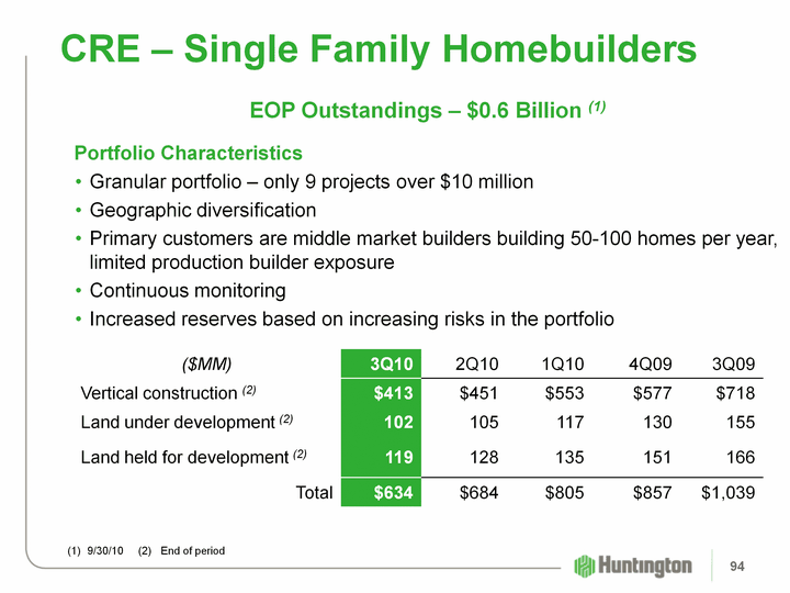 | ($MM) 3Q10 2Q10 1Q10 4Q09 3Q09 Vertical construction (2) $413 $451 $553 $577 $718 Land under development (2) 102 105 117 130 155 Land held for development (2) 119 128 135 151 166 Total $634 $684 $805 $857 $1,039 CRE - Single Family Homebuilders 94 EOP Outstandings - $0.6 Billion (1)Portfolio Characteristics Granular portfolio - only 9 projects over $10 millionGeographic diversificationPrimary customers are middle market builders building 50-100 homes per year, limited production builder exposureContinuous monitoringIncreased reserves based on increasing risks in the portfolio (1) 9/30/10 (2) End of period |