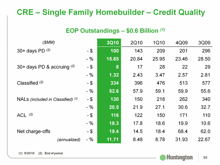 | CRE - Single Family Homebuilder - Credit Quality 95 EOP Outstandings - $0.6 Billion (1) ($MM) 3Q10 2Q10 1Q10 4Q09 3Q09 30+ days PD (2) - $ 100 143 209 201 296 - % 15.85 20.84 25.95 23.46 28.50 30+ days PD & accruing (2) - $ 8 17 28 22 29 - % 1.32 2.43 3.47 2.57 2.81 Classified (2) - $ 334 396 476 513 577 - % 52.6 57.9 59.1 59.9 55.6 NALs (included in Classified) (2) - $ 130 150 218 262 340 - % 20.5 21.9 27.1 30.6 32.7 ACL (2) - $ 116 122 150 171 110 - % 18.3 17.8 18.6 19.9 10.6 Net charge-offs - $ 19.4 14.5 18.4 68.4 62.0 (annualized) - % 11.71 8.48 8.78 31.93 22.67 (1) 9/30/10 (2) End of period |