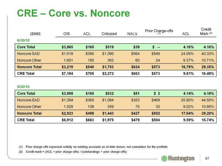 | CRE - Core vs. Noncore 97 ($MM) O/S ACL Criticized NAL's Prior Charge-offs (1) ACL Credit Mark (2) 6/30/10 Core Total $3,965 $165 $519 $39 $ -- 4.16% 4.16% Noncore SAD $1,618 $390 $1,390 $564 $549 24.09% 43.33% Noncore Other 1,601 150 363 60 24 9.37% 10.71% Noncore Total $3,219 $540 $1,753 $624 $573 16.78% 29.35% CRE Total $7,184 $705 $2,272 $663 $573 9.81% 16.48% 9/30/10 Core Total $3,989 $165 $532 $51 $ 2 4.14% 4.18% Noncore SAD $1,394 $360 $1,084 $353 $469 25.80% 44.50% Noncore Other 1,529 138 359 75 33 9.02% 10.95% Noncore Total $2,923 $498 $1,443 $427 $502 17.04% 29.20% CRE Total $6,912 $663 $1,975 $479 $504 9.59% 15.74% (1) Prior charge-offs represent activity on existing accounts as of date shown, not cumulative for the portfolio(2) Credit mark = (ACL + prior charge-offs) / (outstandings + prior charge-offs) |