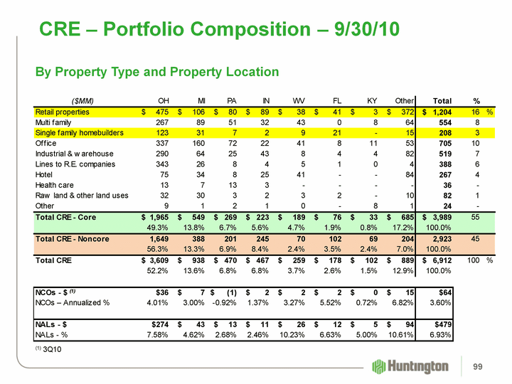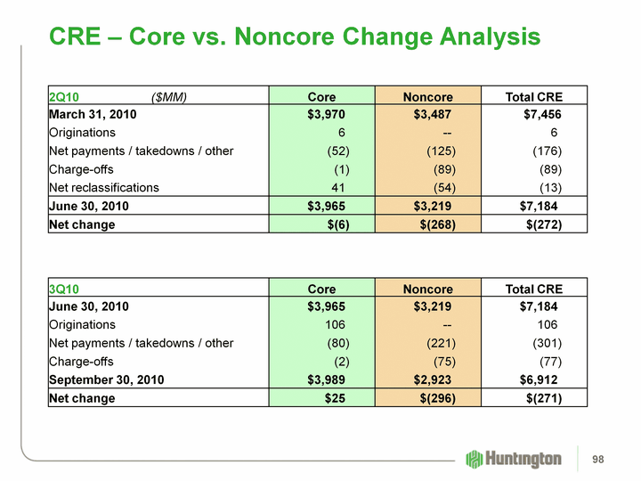 | CRE - Core vs. Noncore Change Analysis 98 2Q10 ($MM) Core Noncore Total CRE March 31, 2010 $3,970 $3,487 $7,456 Originations 6 -- 6 Net payments / takedowns / other (52) (125) (176) Charge-offs (1) (89) (89) Net reclassifications 41 (54) (13) June 30, 2010 $3,965 $3,219 $7,184 Net change $(6) $(268) $(272) 3Q10 Core Noncore Total CRE June 30, 2010 $3,965 $3,219 $7,184 Originations 106 -- 106 Net payments / takedowns / other (80) (221) (301) Charge-offs (2) (75) (77) September 30, 2010 $3,989 $2,923 $6,912 Net change $25 $(296) $(271) |