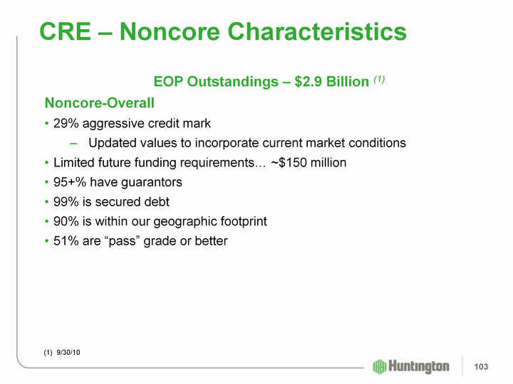 | CRE - Noncore Characteristics 103 EOP Outstandings - $2.9 Billion (1)Noncore-Overall29% aggressive credit markUpdated values to incorporate current market conditionsLimited future funding requirements... ~$150 million95+% have guarantors99% is secured debt90% is within our geographic footprint51% are "pass" grade or better (1) 9/30/10 |