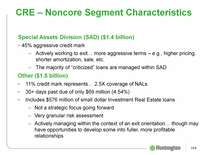 | Special Assets Division (SAD) ($1.4 billion)45% aggressive credit markActively working to exit... more aggressive terms - e.g., higher pricing, shorter amortization, sale, etc.The majority of "criticized" loans are managed within SADOther ($1.5 billion)11% credit mark represents... 2.5X coverage of NALs30+ days past due of only $69 million (4.54%)Includes $576 million of small dollar Investment Real Estate loansNot a strategic focus going forwardVery granular risk assessmentActively managing within the context of an exit orientation... though may have opportunities to develop some into fuller, more profitable relationships CRE - Noncore Segment Characteristics 104 |