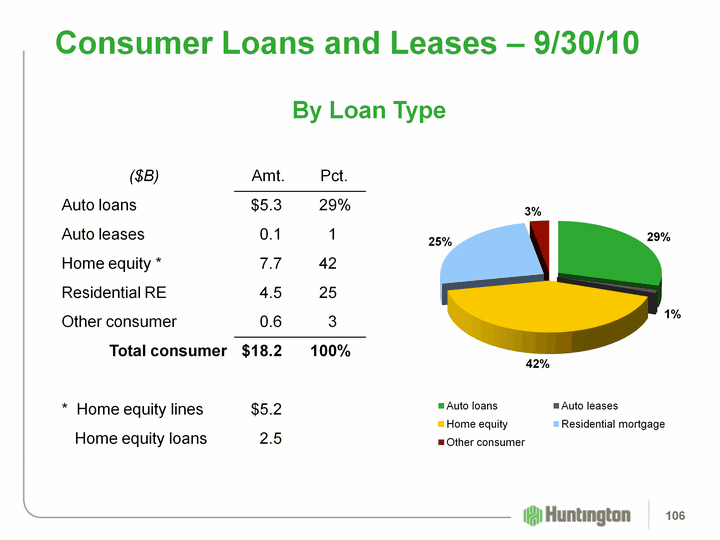 | Consumer Loans and Leases - 9/30/10 106 ($B) Amt. Pct. Auto loans $5.3 29% Auto leases 0.1 1 Home equity * 7.7 42 Residential RE 4.5 25 Other consumer 0.6 3 Total consumer $18.2 100% * Home equity lines $5.2 Home equity loans 2.5 (CHART) By Loan Type |
