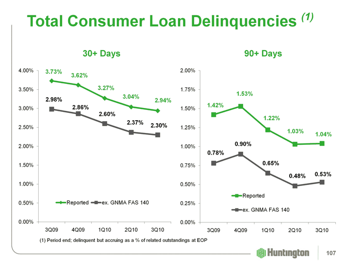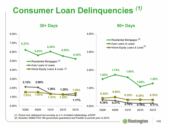 | Consumer Loan Delinquencies (1) 108 (CHART) (1) Period end; delinquent but accruing as a % of related outstandings at EOP(2) Excludes GNMA FAS 140 government guaranteed and Franklin in periods prior to 2Q10 (CHART) (2) (2) (2) (2) 90+ Days 30+ Days |