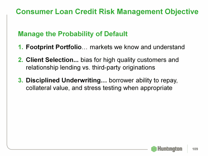 | Consumer Loan Credit Risk Management Objective 109 Manage the Probability of DefaultFootprint Portfolio... markets we know and understandClient Selection... bias for high quality customers and relationship lending vs. third-party originationsDisciplined Underwriting... borrower ability to repay, collateral value, and stress testing when appropriate |