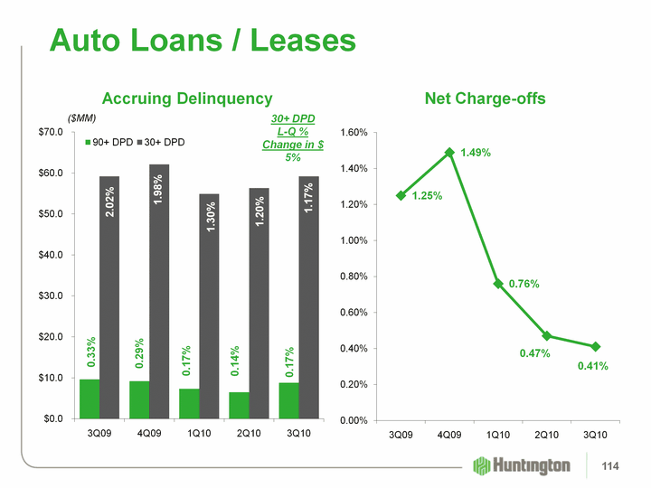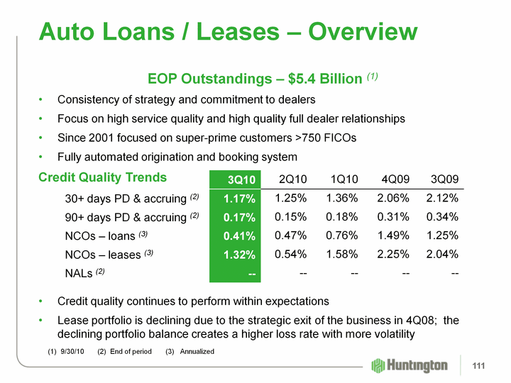 | Auto Loans / Leases - Overview 111 EOP Outstandings - $5.4 Billion (1)Consistency of strategy and commitment to dealersFocus on high service quality and high quality full dealer relationshipsSince 2001 focused on super-prime customers >750 FICOsFully automated origination and booking systemCredit Quality Trends Credit quality continues to perform within expectationsLease portfolio is declining due to the strategic exit of the business in 4Q08; the declining portfolio balance creates a higher loss rate with more volatility 9/30/10 (2) End of period (3) Annualized 3Q10 2Q10 1Q10 4Q09 3Q09 30+ days PD & accruing (2) 1.17% 1.25% 1.36% 2.06% 2.12% 90+ days PD & accruing (2) 0.17% 0.15% 0.18% 0.31% 0.34% NCOs - loans (3) 0.41% 0.47% 0.76% 1.49% 1.25% NCOs - leases (3) 1.32% 0.54% 1.58% 2.25% 2.04% NALs (2) -- -- -- -- -- |