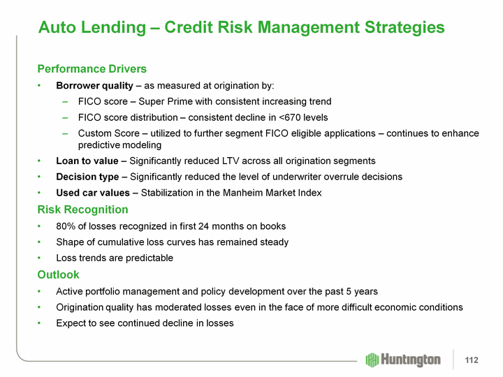 | Auto Lending - Credit Risk Management Strategies 112 Performance DriversBorrower quality - as measured at origination by:FICO score - Super Prime with consistent increasing trend FICO score distribution - consistent decline in <670 levels Custom Score - utilized to further segment FICO eligible applications - continues to enhance predictive modelingLoan to value - Significantly reduced LTV across all origination segmentsDecision type - Significantly reduced the level of underwriter overrule decisionsUsed car values - Stabilization in the Manheim Market IndexRisk Recognition 80% of losses recognized in first 24 months on booksShape of cumulative loss curves has remained steadyLoss trends are predictable Outlook Active portfolio management and policy development over the past 5 yearsOrigination quality has moderated losses even in the face of more difficult economic conditionsExpect to see continued decline in losses |
