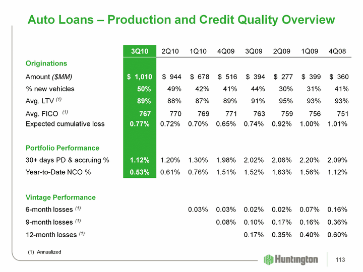 | Auto Loans - Production and Credit Quality Overview 113 113 (1) Annualized |