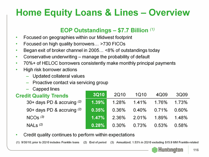 | Home Equity Loans & Lines - Overview 116 EOP Outstandings - $7.7 Billion (1)Focused on geographies within our Midwest footprintFocused on high quality borrowers... >730 FICOsBegan exit of broker channel in 2005... <8% of outstandings todayConservative underwriting - manage the probability of default70%+ of HELOC borrowers consistently make monthly principal paymentsHigh risk borrower actionsUpdated collateral valuesProactive contact via servicing groupCapped linesCredit Quality TrendsCredit quality continues to perform within expectations 9/30/10; prior to 2Q10 includes Franklin loans (2) End of period (3) Annualized; 1.53% in 2Q10 excluding $15.9 MM Franklin-related 3Q10 2Q10 1Q10 4Q09 3Q09 30+ days PD & accruing (2) 1.39% 1.28% 1.41% 1.76% 1.73% 90+ days PD & accruing (2) 0.35% 0.36% 0.40% 0.71% 0.60% NCOs (3) 1.47% 2.36% 2.01% 1.89% 1.48% NALs (2) 0.28% 0.30% 0.73% 0.53% 0.58% |