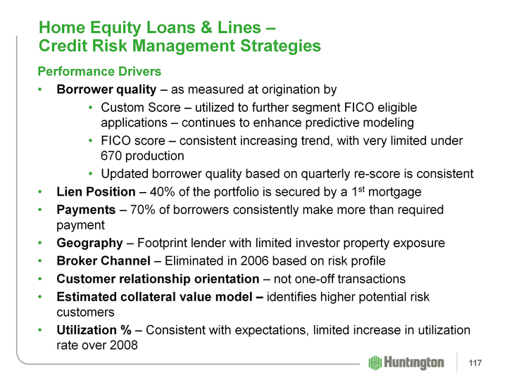 | Home Equity Loans & Lines - Credit Risk Management Strategies 117 Performance DriversBorrower quality - as measured at origination byCustom Score - utilized to further segment FICO eligible applications - continues to enhance predictive modeling FICO score - consistent increasing trend, with very limited under 670 productionUpdated borrower quality based on quarterly re-score is consistent Lien Position - 40% of the portfolio is secured by a 1st mortgagePayments - 70% of borrowers consistently make more than required paymentGeography - Footprint lender with limited investor property exposureBroker Channel - Eliminated in 2006 based on risk profileCustomer relationship orientation - not one-off transactionsEstimated collateral value model - identifies higher potential risk customersUtilization % - Consistent with expectations, limited increase in utilization rate over 2008 |