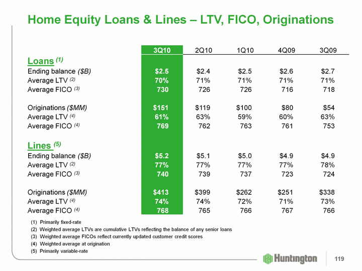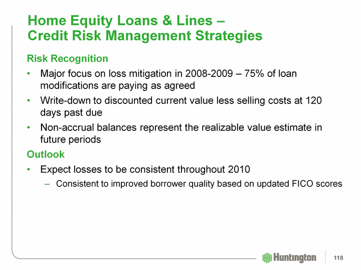 | Home Equity Loans & Lines - Credit Risk Management Strategies 118 Risk Recognition Major focus on loss mitigation in 2008-2009 - 75% of loan modifications are paying as agreedWrite-down to discounted current value less selling costs at 120 days past dueNon-accrual balances represent the realizable value estimate in future periods OutlookExpect losses to be consistent throughout 2010Consistent to improved borrower quality based on updated FICO scores |