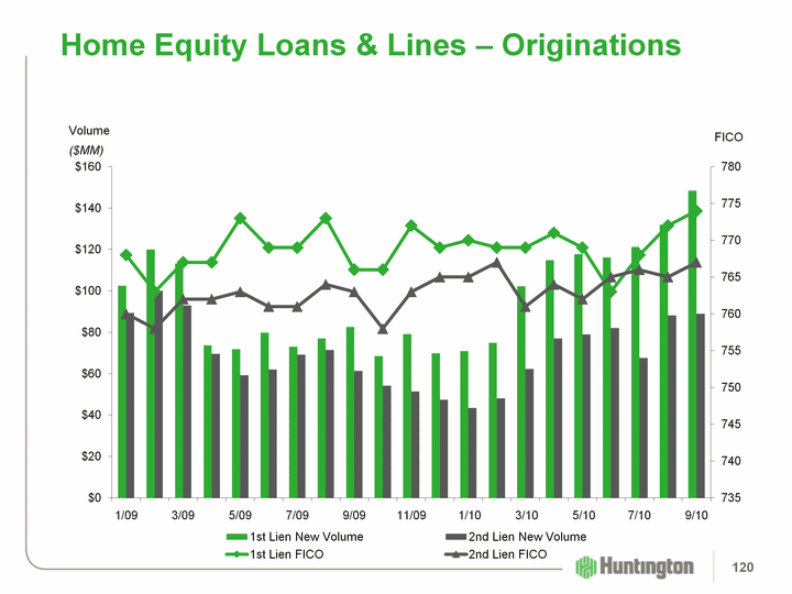 | Home Equity Loans & Lines - LTV, FICO, Originations 119 (1) Primarily fixed-rate (2) Weighted average LTVs are cumulative LTVs reflecting the balance of any senior loans(3) Weighted average FICOs reflect currently updated customer credit scores(4) Weighted average at origination(5) Primarily variable-rate 3Q10 2Q10 1Q10 4Q09 3Q09 Loans (1) Ending balance ($B) $2.5 $2.4 $2.5 $2.6 $2.7 Average LTV (2) 70% 71% 71% 71% 71% Average FICO (3) 730 726 726 716 718 Originations ($MM) $151 $119 $100 $80 $54 Average LTV (4) 61% 63% 59% 60% 63% Average FICO (4) 769 762 763 761 753 Lines (5) Ending balance ($B) $5.2 $5.1 $5.0 $4.9 $4.9 Average LTV (2) 77% 77% 77% 77% 78% Average FICO (3) 740 739 737 723 724 Originations ($MM) $413 $399 $262 $251 $338 Average LTV (4) 74% 74% 72% 71% 73% Average FICO (4) 768 765 766 767 766 |