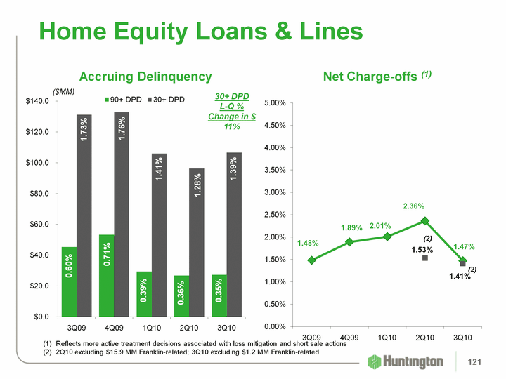 | (CHART) Home Equity Loans & Lines 121 (CHART) 0.39% 0.36% 0.60% 1.41% 1.28% 1.73% ($MM) 30+ DPD L-Q % Change in $ 11% 0.71% 1.76% Net Charge-offs (1) Accruing Delinquency Reflects more active treatment decisions associated with loss mitigation and short sale actions2Q10 excluding $15.9 MM Franklin-related; 3Q10 excluding $1.2 MM Franklin-related (2) 1.39% 0.35% (2) |